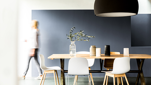 Trong hình trên, một khối màu xanh dương rực rỡ làm nổi bật khu vực ghế sofa trong phòng khách, trong khi sử dụng Màu Nâu Mật Nồng nhiều hơn, Màu sơn Naldo 2020, sẽ mang lại sự thực tế cho khu vực làm việc liền kề. Đồ nội thất đơn giản và chậu cây xanh mát trong nhà cho không gian thêm hoàn thiện và tương sáng.