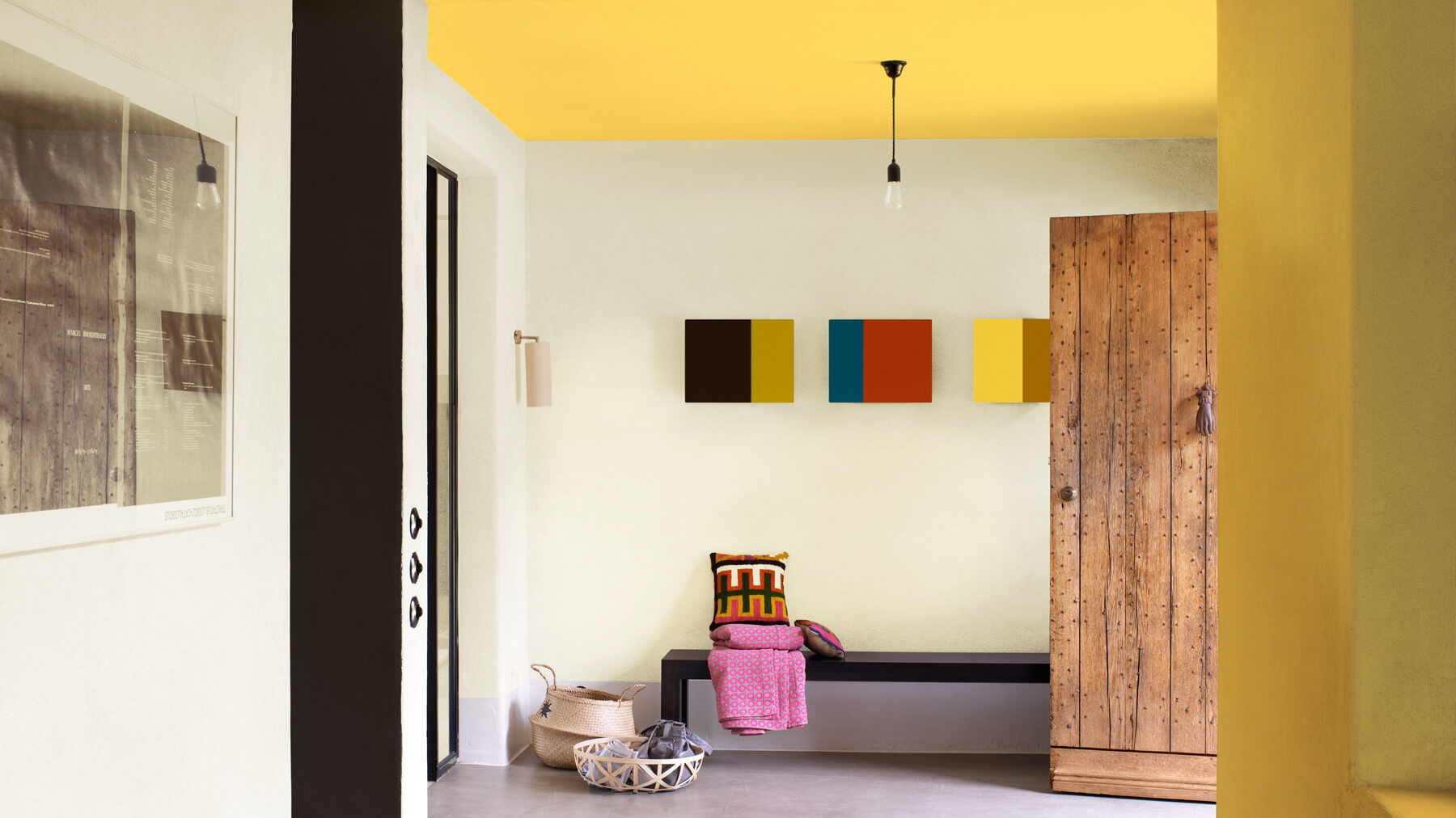 Một trần nhà sáng bất ngờ được sơn trong một sắc thái táo bạo và hạnh phúc như Banana Split có thể đặt một mùa xuân trong bước chân của bạn khi bạn bước vào và ra khỏi cửa. Tạo nên một kỳ nghỉ quanh năm bằng cách thêm vào thảm in aztec và giỏ dệt bằng gỗ. Giữ các bức tường liền kề của bạn trong màu sắc nhẹ để giữ cân bằng.